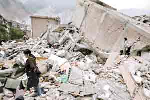 记者从李金泰家往回走的路上,经过一排倾斜的房屋前时,走在记者前面的一名医务兵突然呼喝了一声:“快走!”医务兵拼命地往空旷地段奔去,一个本能的反应——余震!记者夺命地跟着医务兵跑离倾斜房屋的楼下。果然,又是一阵从地底传来的轻微摇晃。“你们两个要小心啊,这些楼房已经没有支撑点的了,再来多几次余震的话,说倒就倒的。”医务兵告诫记者。尽管暂时安全了,但刚才一幕让记者真切地感受到大地震发生的那一瞬间的恐怖。