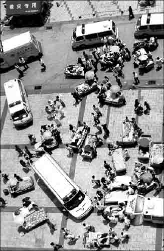 为了使伤员得到更好的治疗和照顾,部分伤员将从绵阳转至重庆。从17日晚10时开始,500多辆急救车开始了转移伤者的行动。