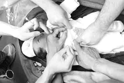 一个40岁左右,从汶川走出来的妇女脱掉鞋,脚底板上全是大泡。被刺破时疼得哇哇直叫。