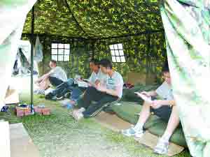 四川省北川中学,这块明显有些泛旧的校牌,此时端正地悬挂在位于绵阳市长虹培训中心一座二层小楼的外墙上。培训中心的大门被拳头粗的铁锁牢牢关紧,只有当教职员工或记者进出时,才会挤出一条狭窄的缝隙。走进其中,人们可以看到一座座整齐排列的绿色迷彩帐篷,不时会有孩子们擦身而过。他们的脸上没有忧伤,尽管他们才刚从梦魇中惊醒。