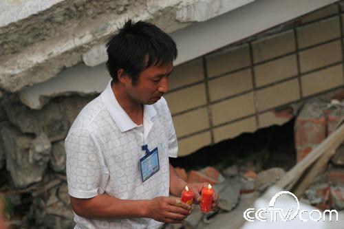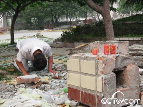 “孩子们,没有全部救出你们我很内疚,我会记住你们忌日的,每年的这一天我都会来看你们,给你们送学习用品。你们生前都很团结,在天堂也要相互关照好,老师每天都在想念着你们!”在北川中学(新区)的废墟下,记者看到一名中年男子跪在地上,哭得很悲伤,还向遇难的同学叩拜。记者跑过去一看,此人就是北川中学的校长刘亚春。他告诉记者,地震后他一直在忙碌抢救学生的事,没有时间来看望这些还埋在废墟下的数百名学生。今天他在百忙之中,抽时间来看看这些孩子们,他将带来的蜡烛点燃后放在废墟下,双手合十,默默地祈祷,然后跪在地上给在地震中失去生命的学生磕了三个响头。