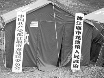 地震发生后,都江堰市龙池镇政府楼垮塌严重,部分房屋坍塌成一堆废墟,未倒的办公室全成了危房。昨天,记者来到这里看到的却是另一番景象:现场,许多彩条布搭建成座座“帐篷”,“帐篷”旁矗立着“中国共产党都江堰市龙池镇委员会”和“都江堰市龙池镇人民政府”两块牌子,高高的竹竿上飘扬着一面五星红旗,宣告着龙池镇抗震救灾指挥部成立,各项工作现逐步走上正轨。