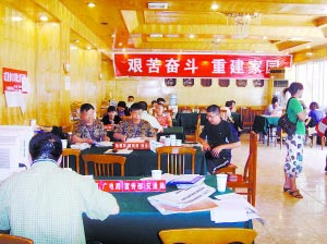 在餐厅一角,堆放着不少单位的标牌,这些单位还没有在办事处设点。“有的是实在抽不出人,还有的根本没法派人来。”宣传部一位工作人员介绍,有些单位在地震后就完全没有人了,“太惨了”。