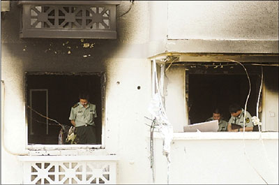 事发房间损毁严重,消防员在勘察现场。