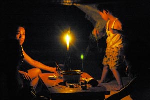 入夜,电路无法覆盖的山上临时安置点,居民只得秉烛谈心。