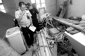 昨日,北川曲山镇景家村,几名警察在一户村民的地下室里发现了一台洗衣机和一些建筑材料。薛珺 摄