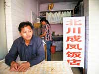 昨天,记者来到菜户营东街,果然在街面上看到了“北川成凤饭店”白底红字的招牌。小吃店周围的居民说,小店原来是“自家菜餐馆”,店主是北京人,几天前才将小店转给了一对外地夫妇,他们将名字变更为“北川成凤”。小吃店就餐区域不到10平方米,四五张桌子,桌旁的墙上贴着两张菜谱,其中一道被网友在帖子中指责的“北川自制辣肠”的菜名中“北川”两个字已经被油笔涂掉了。此时店内并无食客,只有40岁左右的一男一女(见图)。男子告诉记者,他们就是小吃店的经营者,昨天中午工商局的工作人员突然造访了小吃店,责令他们将店名及菜谱中的“北川”二字去掉,“菜谱上的字是他们涂掉的。”