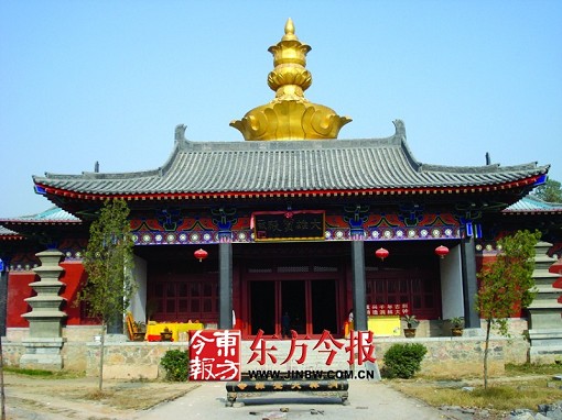 方鼎模样的山门上方是少林寺方丈释永信手书的“洞林大觉禅寺”六个镀金大字。老人的视线前方,是一座已经投入使用的仿印度风格的大雄宝殿,大殿前方正在建造的高30多米的两座钟鼓楼,已显气势。2008年11月3日上午,位于荥阳市贾峪镇洞林村的洞林寺正在紧张施工。