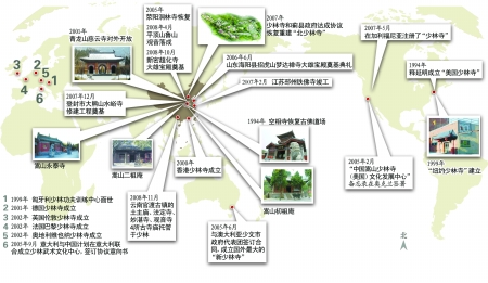 就像在世界各地都能吃到麦当劳一样,如今,在全球各地也能轻松地学到少林功夫。尽管少林寺方丈释永信曾对媒体大声辩解:我们不是麦当劳,不愿意少林功夫商业化。但这座千年古刹分院却遍布全球,已经达到20多家,而且扩张的势头,正加速前进。