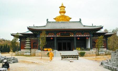 同是少林寺下院的荥阳市贾峪镇洞林寺目前也正在紧张施工中。记者在现场看到,方鼎式的山门上方已经镌刻上了释永信手书的“洞林大觉禅寺”六个鎏金大字。轴线北方100米仿印度风格的大雄宝殿也已投入使用。