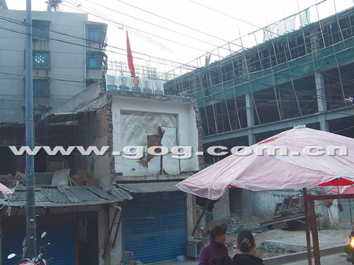 12月3日傍晚6时许,在接到网友报料后,记者赶到了现场,看到一片在建的大楼旁,三栋连在一起的破旧小矮房显得格外扎眼,其中一楼顶上还悬挂着国旗和一些伟人的照片。