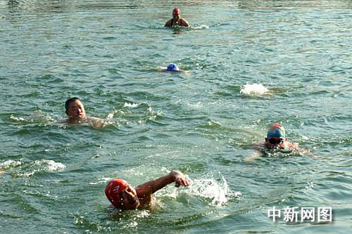 中新网济南1月1日电(记者 张荣容 见习记者 赵金鹏)2009年的第一天,全国第二届冬泳大赛在山东省城济南大明湖景区内举行。来自北京、天津、山东济南、东营、滨州等省市的17支代表队116名冬泳爱好者相聚济南大明湖畔,不畏零下8摄氏度的严寒,以冬泳的方式迎接新一年的开始。