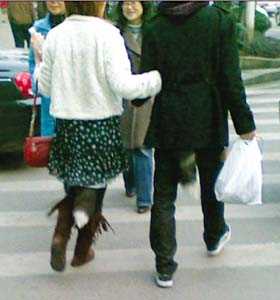 一对年轻的情侣手挽手走在大街上,两人衣服背后竟各有一条狐狸尾巴。1月19日,有网友在网上发帖称,自己在杨家坪直港大道遇到了身着“狐尾装”的一对男女,并附有手机拍摄的照片。该帖发出后,引来网友热议,许多80后的网友直呼“妖孽”,并大叹跟不上这种怪异潮流。