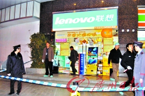 就在这家专卖店隔壁的7-11便利店的一名陆姓工作人员说,晚上大约7时30分,她在便利店里工作时,突然听到隔壁“嘭”的一声响,她赶紧到隔壁看看情况,就在联想专卖店门口不远处,一个男子倒在地上,他的身上流了很多血。