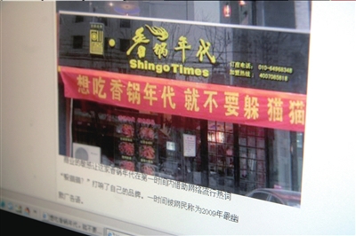 据悉,2月22日上午,这家饭店在大门外悬挂了“想吃香锅年代,就不要躲猫猫”的横幅,有路过的市民将这一横幅拍照,并发布在了猫扑等各大网络论坛上,引发众多网民热烈讨论。