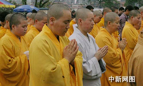 中新网重庆5月12日电 (孟幻 张晅)12日,汶川大地震周年祭之时,重庆佛教界人士在重庆华岩寺举行悼念及祈福活动。14时28分,在场僧众及300余位信众默哀3分钟。随后,华岩寺方丈道坚法师带领僧众举行祈福消灾法会,为汶川地震灾区诵经祈福,同时祈求风调雨顺,国泰民安。完