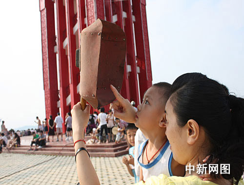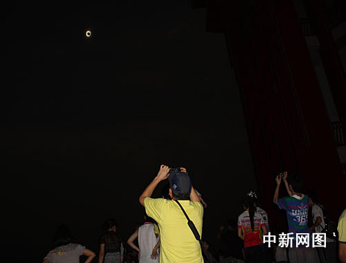 从21晚10时开始,陆续有民众登上当地著名景点凤凰山,等候日全食。22日7时许,记者在凤凰山上山沿途看见数以万计的民众扶老携幼,手持X光片、电焊防护镜、黑色玻璃片、水盆等观看工具,在凤凰山上寻找最佳观看位置。