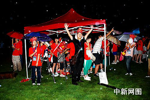 乌克兰日全食观测队、俄罗斯观测队、北京日全食观测队……各个队伍在雨中紧张地等待着,现场的喇叭里不断传来其他观测点的最新消息,然而8:22分初亏的时刻到来时,雨未停。终于9:35,日全食的一刻天全部黑了下来,虽然看不到,但现场还是响起了持续不断的欢呼和尖叫声,五分钟的时间里,黑暗的山坡上闪关灯不断,俨然一个“巨星演唱会”的阵势。
