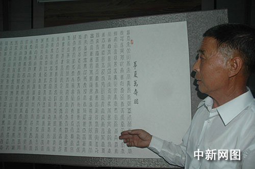 中新网唐山9月8日电 (白云水 雷向东)8日,河北省遵化市退休干部刘宗易80米长、由10000个异体寿字组成的“华夏万寿图”正式完成。刘宗易称,此举为庆祝新中国成立60周年献礼,寄托自己对祖国的一片祝福之情。