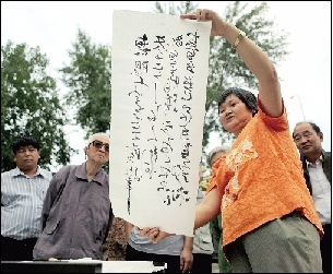 曾经为了练脑子恢复失去的记忆,湖南农妇夏艳芬偶然开始练习正反两面书写自己的名字。时隔9年,连笔反写毛笔字成了她的绝活。近日,她完成60幅毛泽东诗词连笔反写书法创作,并多次来到天安门广场免费为路人书写国庆标语,以此献礼国庆60周年。