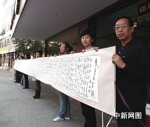 中新网乌鲁木齐9月24日电(王小军)新疆乌鲁木齐一残疾人身残志坚,闲暇之余,拿起手中的画笔,书写下一幅13米长卷,献给新中国成立六十周年。
