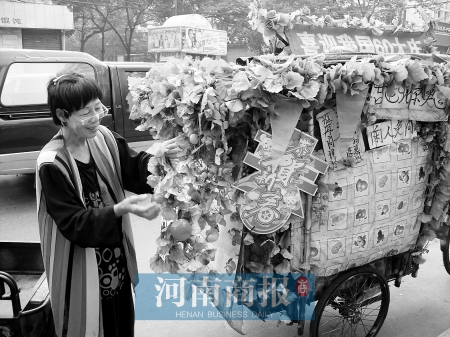 昨日上午10时许,一辆披着鲜花,插着国旗的彩色三轮车出现在郑州市经八路上。