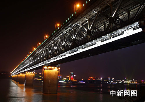 中新网10月1日电(张畅)万里长江第一桥横跨龟蛇二山,作为武汉“九省通衢”地位的象征,在外侧变色LED轮廓灯的映衬下,整座桥在水中波光点点,好似龙鳞落江。