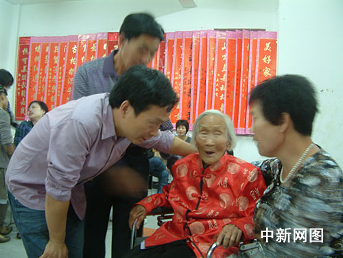 埠头村的这位百岁老人叫吴美华。到现在,老太太已经是五代同堂了,其下面后代已经有100多人了。今天,老人的所有后代都从甘肃、江苏、贵州、江西等全国各地赶回来团聚。