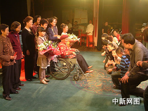 中新网义乌10月1日电(陈国亮 甘小虎)今天是祖国60大庆,浙江省义乌市廿三里街道埠头村的村民们也很开心,上午高高兴兴的通过电视观看了盛大的天安门阅兵仪式,晚上有很多老年村民都涌到村里晒场上看起了社戏。因为今天,也是该村有史以来第一个百岁老人过百岁大寿的日子,村里要连续演三天四夜的社戏,而且是浙江婺剧团的角儿来演。村民们能不开心吗?