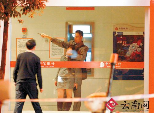 10月31日22:30左右,昆明市北京路一自助银行内,一男子挟持一名妇女,正在与警方对峙。