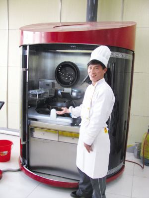 记者昨日在现场看到,“爱可2.0”高约2米,宽约1.8米,有拉门封闭,里面有特制的烹饪设备,有锅,有自动喷油、喷水、搅拌设备,与之相连接的是一个智能化触摸屏,上面是系统控制界面。在正式烹饪前,早已“定量”好的主料、配料和作料都被放在专用盒子里。工作人员将“杭椒牛柳”的材料送入“爱可2.0”,在触摸屏输入程序,机器人开始工作。
