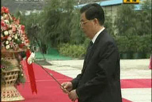 纪念四川汶川特大地震一周年活动12日下午在四川省汶川县映秀镇举行。中国国家主席胡锦涛手持菊花,缓步走到四川汶川特大地震记事墙前,为遇难者献花。