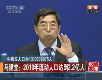 28日,国新办举行新闻发布会,国务院第六次全国人口普查领导小组副组长、国家统计局局长马建堂发布2010年第六次全国人口普查主要数据公报(第1号)。马建堂在会上说,中国在人口发展面临一些矛盾和挑战:老龄化、人口流动规模扩大以及性别比偏高。