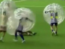 特殊足球赛:球员身上套个球 踢“弹力足球”