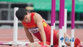 刘翔跨越第一栏摔倒瞬间慢镜头