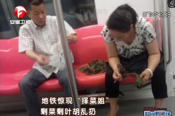 地铁现"择菜姐" 剩菜剩叶胡乱扔