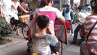 小学生坐电动车趴妈妈背上写作业