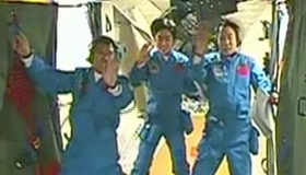 中国航天员天宫一号内挥手致意