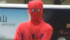三男子扮蜘蛛侠手持横幅讨薪