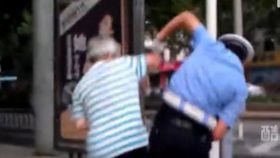 闯红灯老汉大战协警 吐痰打“太极”