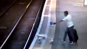监拍男子将小车推入轨道逼停火车惊险一幕