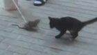 实拍小猫碰到老鼠怕得到处乱窜