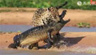 美洲虎涉水偷袭鳄鱼