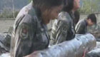女兵训练抱圆木仰卧起坐