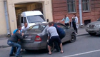 俄五名壮汉抬走占道轿车
