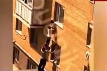 实拍女婴爬出窗台 路人叠罗汉搭人梯救援