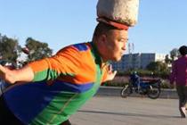 大叔头顶水泥墩健身 三年减重60斤