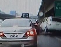 台北市的一段繁忙公路上,一辆白色轿车为了躲避警察高速行驶在路间,却卡在了公路上。