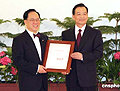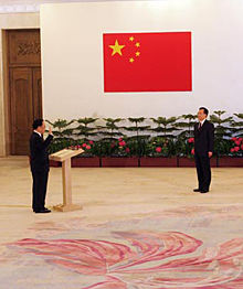 6月24日上午9时,香港特区行政长官曾荫权就职仪式在人民大会堂香港厅举行。曾荫权向温家宝总理宣誓就职。温家宝总理向曾荫权颁发了中央人民政府任命书