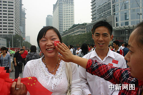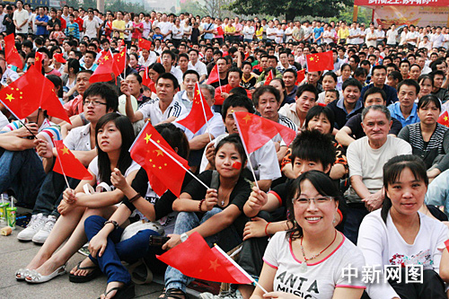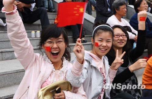图:黑龙江大学生挥舞国旗为祖国欢呼